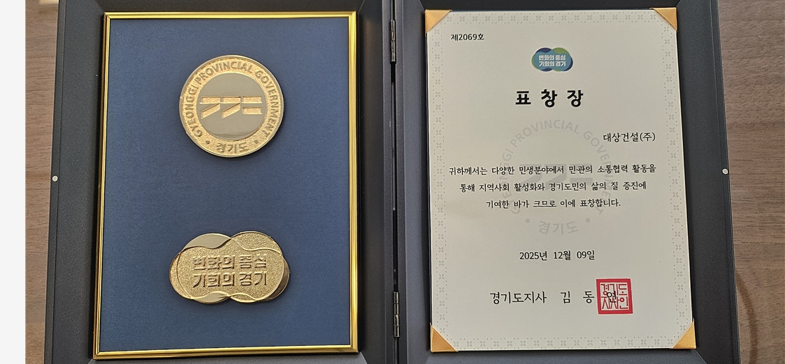 대상건설(주)이 민생 분야에서 민관 소통·협력 활동을 통해 지역사회 활성화와 도민 삶의 질 향상에 기여한 공로로 김동연 경기도지사 표창을 수상했다.